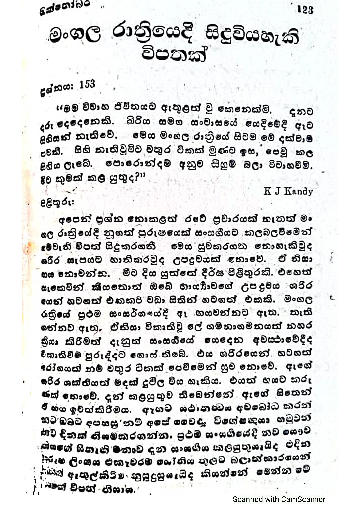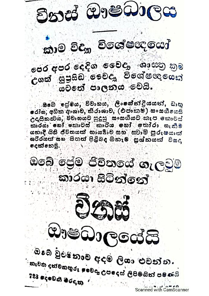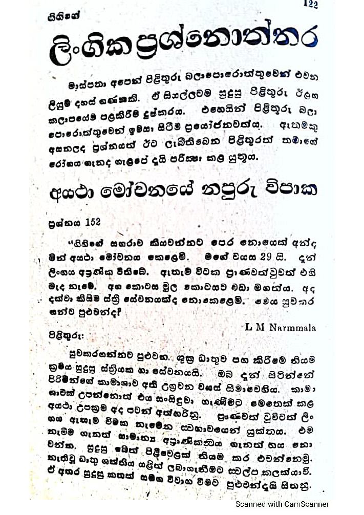 ගිහිගේ සඟරාවෙ කතුවැකිය වෙන රහස තමන්ගේ පාඨකයාට කියන්නෙ එහෙමයි. ඒ කාලෙත් සෙක්සොලොජිස්ට්ලා ඉන්නවා. ඒ ගැන දැන්වීම් පළවෙනවා. හැබැයි මොනවගේ උපදෙස් දුන්නද කියල නම් ෂුවර් නෑ. ඩියුරෙක්ස් ලිංගාවරණ සහ කංචුක ගැන දැන්වීම් පලවෙනවා.