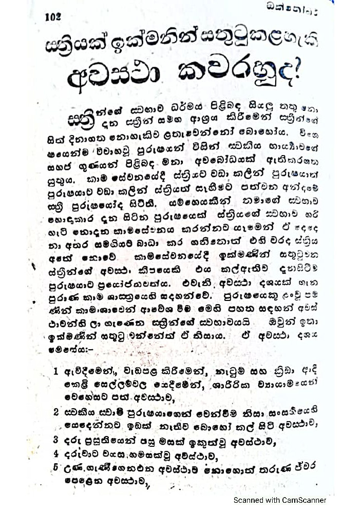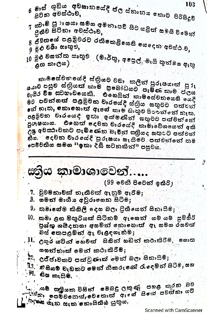 ස්ත්රියක් කාමාශාවෙන් පෙළෙන බව වටහා ගන්න විදිහ විස්තර කරනවා. ලස්සනම දේ ළඟම ඉන්න පොඩි එකෙක් වඩාගෙන පේන්න හුරතල් කරන එක. ඇඟ කම්මැලි අරින්න වගේ ඇඹරුනත් ෂුවර් නෑ.