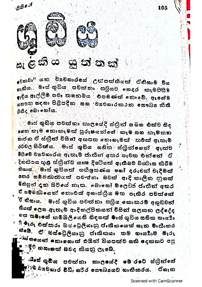 ඒ වගේම කාම ලැදි වුනාට මත්විරෝධී ගතියකුත් තියෙනවා. ගෑනුන්ගෙ පීරියඩ්ස් ගැන එහෙම කියනවා මරු කතා ටිකක්. යුරෝපියන්ගේ මතය වැරදියි කියමින් පරණ සාම්ප්රදායික පීරියඩ් විරෝධයම අරගෙන එනවා. ඒ ආර්ටිකල් එකේම පෑඩ් විකුණනවා.